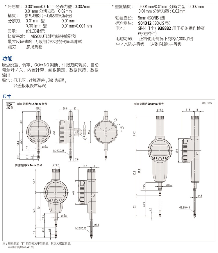 | 543-394 | 543-394B | 0.001mm | 12.7mm | 0.003mm | 0.4N-0.7N | 低测力 |
