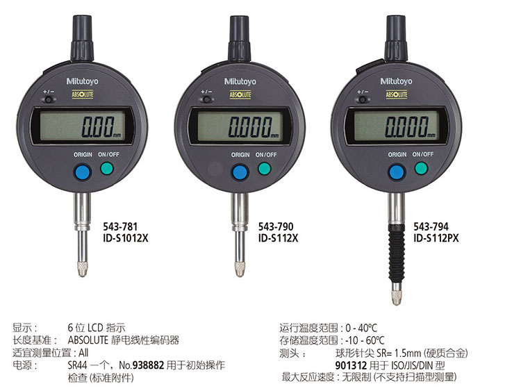 ID-SX 指示表使用扣式电池(SR44),其功能简捷便于使用。可选择产品阵容中测量分辨力